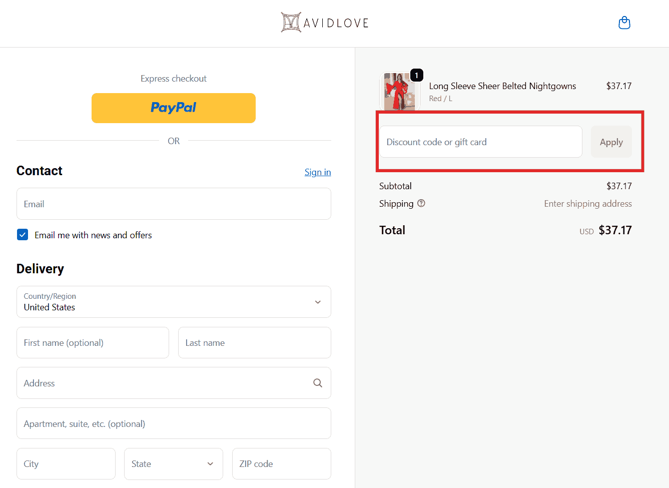 You can see in the image below where to apply the Avidlove discount code. Enter the coupon code in this box and click apply to get an instant discount.
