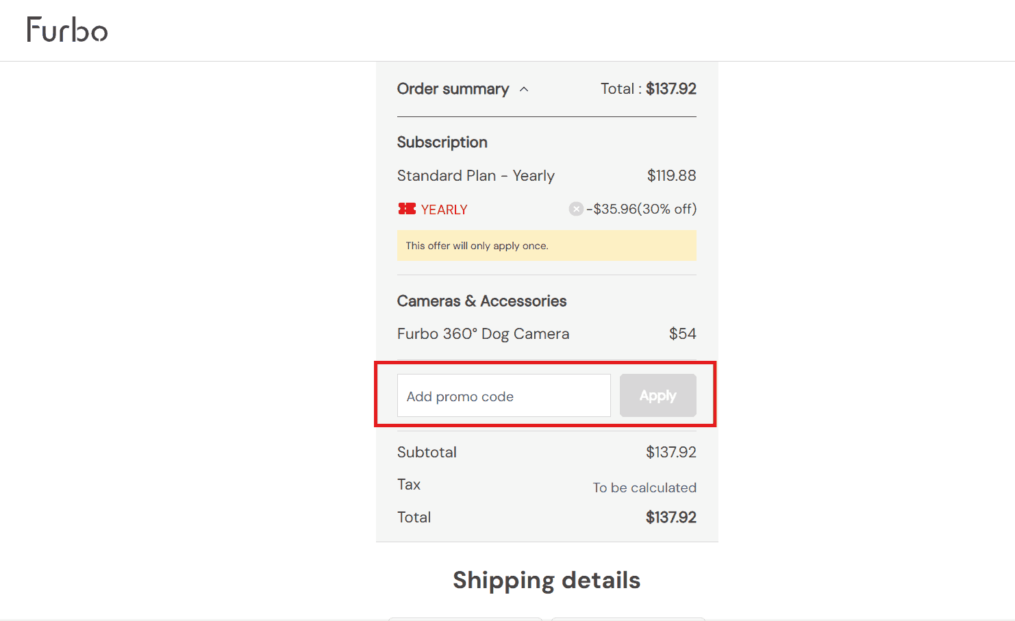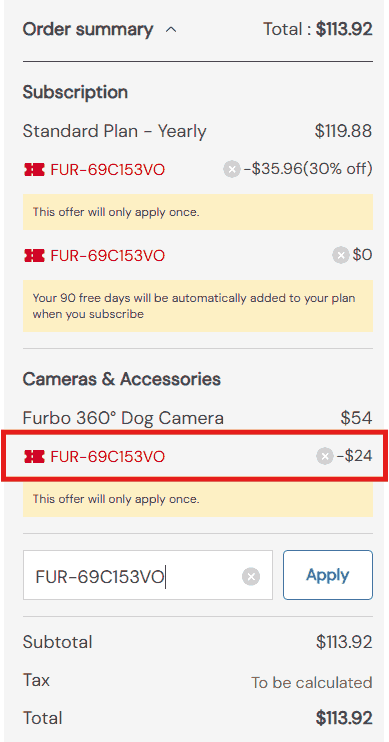 You can see in the image below where to apply the Furbo discount code. Enter the coupon code in this box and click apply to get an instant discount.