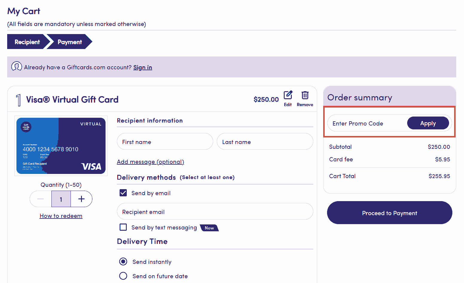 You can see in the image below where to apply the Giftcards.com discount code. Enter the coupon code in this box and click apply to get an instant discount.