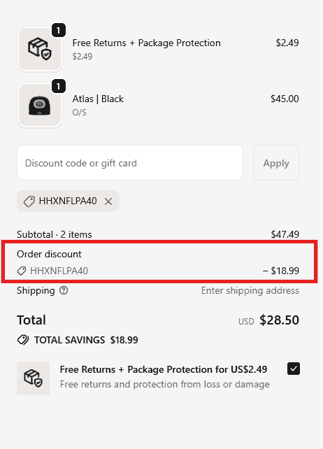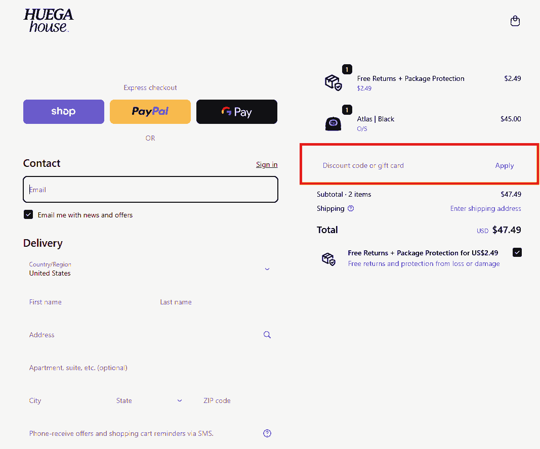 You can see in the image below where to apply the Huega House discount code. Enter the coupon code in this box and click apply to get an instant discount.