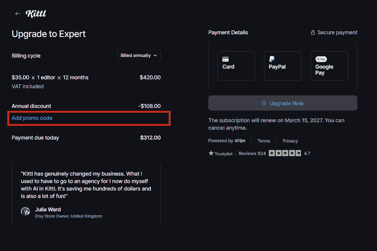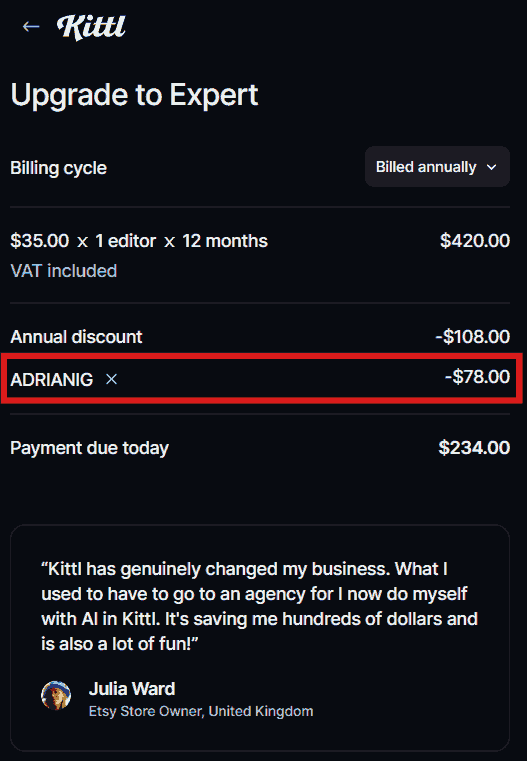 You can see in the image below where to apply the Kittl discount code. Enter the coupon code in this box and click apply to get an instant discount.