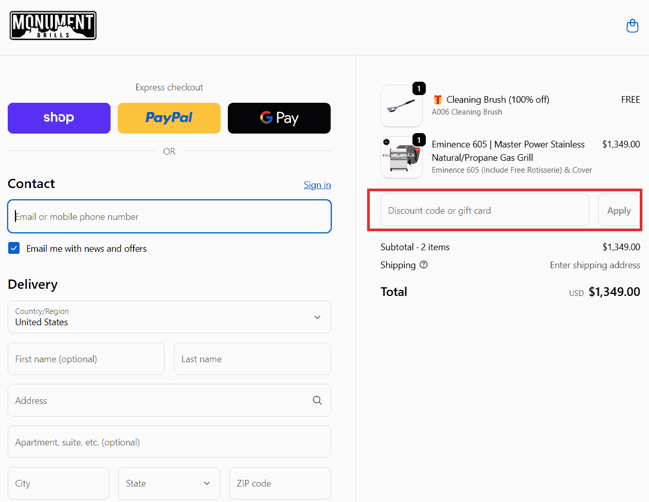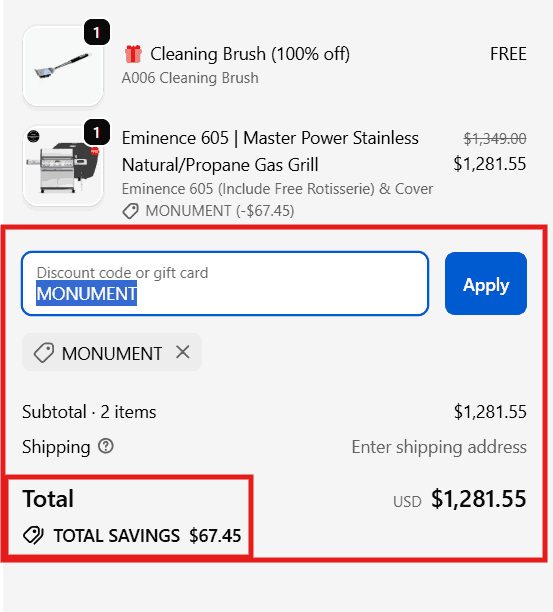 You can see in the image below where to apply the Monument Grills discount code. Enter the coupon code in this box and click apply to get an instant discount.