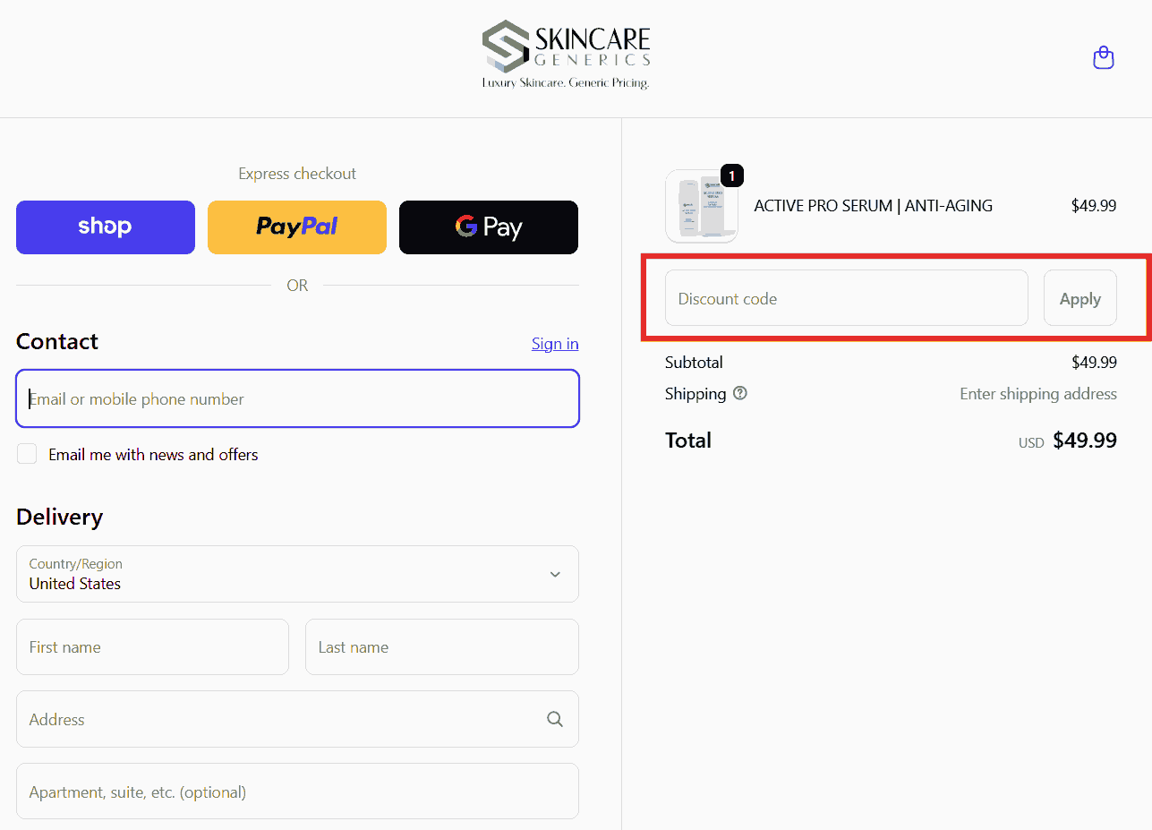 You can see in the image below where to apply the Skincare Generics discount code. Enter the coupon code in this box and click apply to get an instant discount.