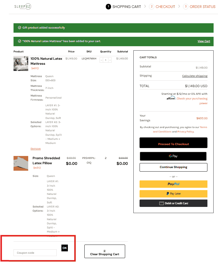 You can see in the image below where to apply the Sleep EZ discount code. Enter the coupon code in this box and click apply to get an instant discount.