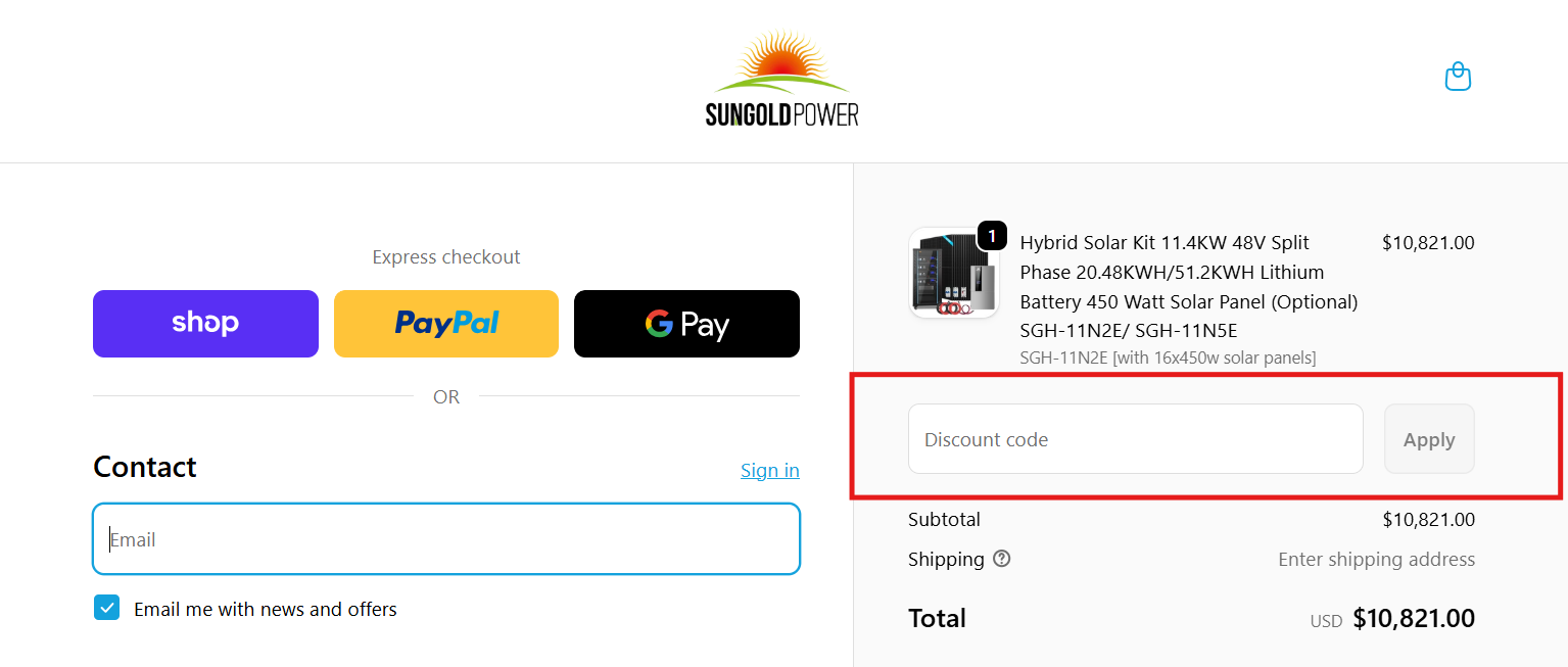 You can see in the image below where to apply the SunGoldPower discount code. Enter the coupon code in this box and click apply to get an instant discount.