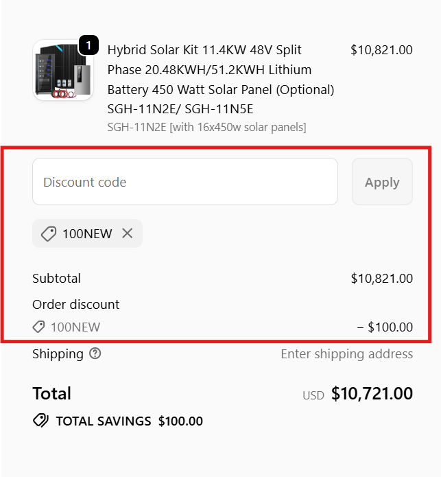 For home use, you can choose Complete Hybrid Solar Kits, such as the 11.4KW 48V Split Phase system with 20.48KWH / 51.2KWH Lithium Battery and 450W Solar Panels (SGH 11N2E or SGH 11N5E). You can get an excellent discount on these products when you purchase using the RaferDiscount.