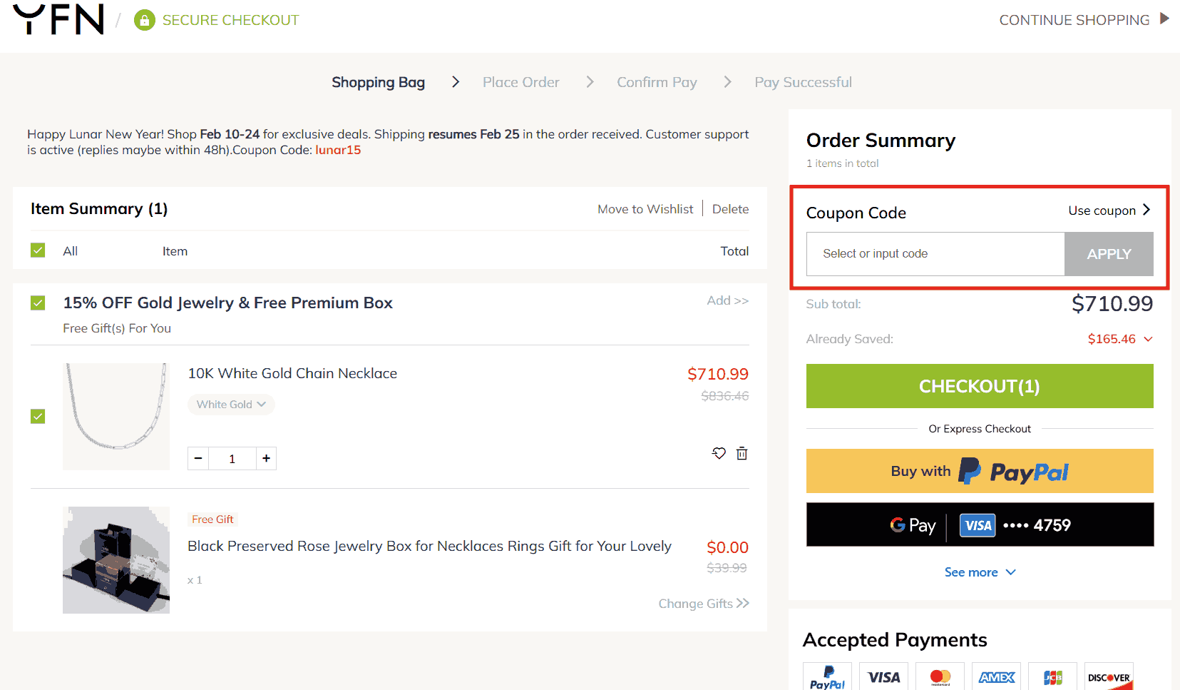 You can see in the image below where to apply the YFN discount code. Enter the coupon code in this box and click apply to get an instant discount.