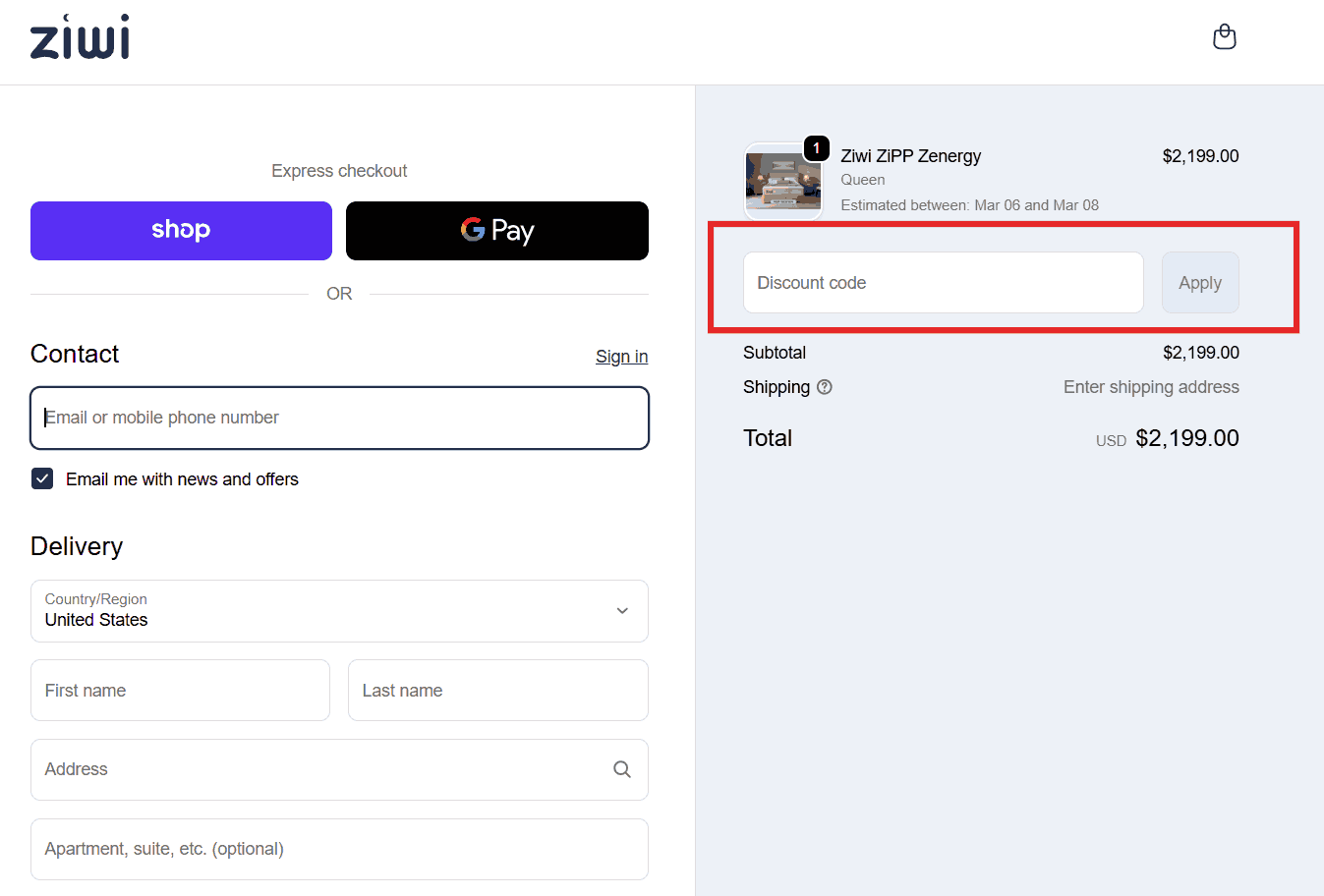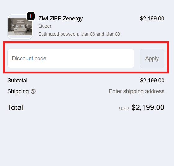 You can see in the image below where to apply the Ziwi Mattress discount code. Enter the coupon code in this box and click apply to get an instant discount.
